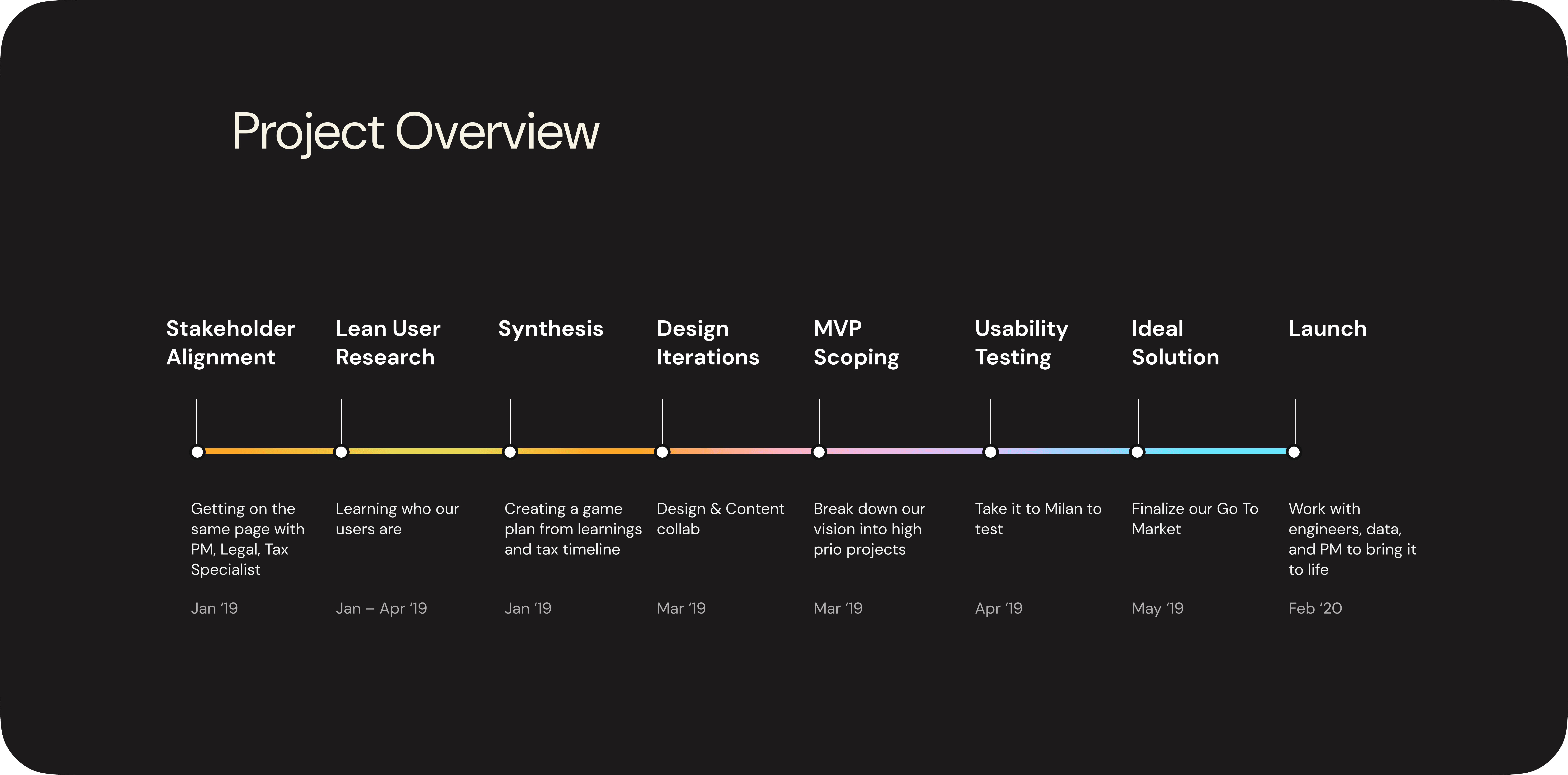 Taxfix is Germany's most popular tax filing app. It's an expert service to help have your taxes done quickly, easily, and without any complications. After a successful 3 years on the German market, we wanted to launch our first expansion market in Italy. In this project, I led a structured design process: research, hypothesis testing, prototyping, and MVP development—delivered within an ambitious timeline of 1 year to hit the 2020 tax season.